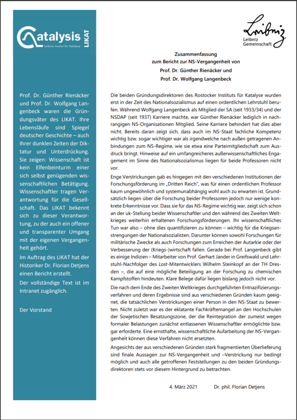 Prof. Dr. Günther Rienäcker and Prof. Dr. Wolfgang Langenbeck were the founding fathers of LIKAT. Their lives are a mirror of German history - including its dark times of dictatorship and oppression. They show: Science is not an ivory tower of self-sufficient scientific activity. Scientists bear responsibility for society. LIKAT is committed to this responsibility, which also includes dealing openly and transparently with its own past.