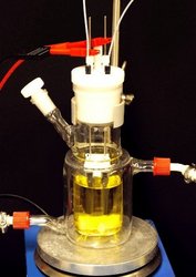 Another thematic focus is on catalytically active materials for the electrochemical conversion of small molecules (CO2, H2O, N2, etc.). For the electrochemical characterization of heterogeneous electrocatalysts, several potentiostats with rotating disk electrode (RDE) and impedance spectroscopy are available. We have the possibility to perform photoelectrochemical investigations as well as spectroelectrochemical analyses. Furthermore, new materials can also be tested in a laboratory fuel cell / electrolyzer; the electrode sheets (surface area: 25 cm²) are coated with the active material using the airbrush method. In addition to the classical chemical methods for material synthesis, we have several furnaces for thermal treatments. Particularly for aqueous processes, freeze-drying can be used for treatment of the products.