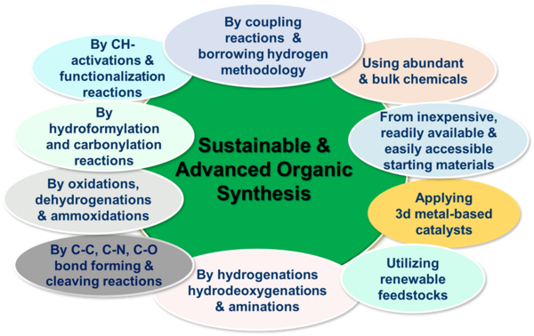 Chemical synthesis (organic synthesis) occupies a unique position in chemistry, the central science, with a profound impact on the modernization of society and human lives. Organic synthesis is an imperative tool that has the power to replicate the fascinating molecules of living nature in the laboratory and industry. These synthetic strategies allow to produce chemical products, materials and life science molecules for potential applications in chemistry, biology, medicine and other areas of science and technology as well as in daily life activities. Considering the importance of organic synthesis, there is a strong demand for the advancement of more sustainable, efficient, selective, cost-effective and innovative organic synthetic methods. This paramount importance stems from the need to move away from traditional methods, which are often inefficient, energy-intensive, and produce hazardous waste. In our group, we are working on the development of more sustainable catalytic methodologies for the synthesis of industrial fine and bulk chemicals, functionalized and structurally diverse molecules, pharmaceuticals, agrochemicals and biomolecules. For these syntheses, we apply catalytic C-N, C-C, C-O and C-X (X=F, Cl and Br) bond forming and cleaving reactions. More specifically, we apply industrially relevant processes such as catalytic hydrogenations, aminations, oxidations, ammoxidations, dehydrogenations, hydrodeoxygenations, coupling reactions as well as CH-activation and functionalization reactions. To carry out these processes, we use inexpensive and readily available starting materials and renewable feedstocks, as well as abundant and more environmentally friendly reagents.
