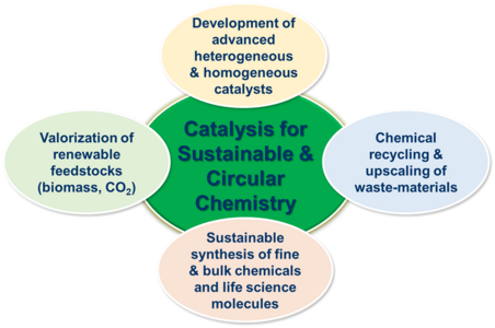 Given the importance of sustainable and circular chemistry, our group’s research focuses on the development of environmentally beneficial, economically viable and industrially feasible catalytic processes for advanced organic synthesis, valorization of renewable feedstocks and recycling/upscaling of waste materials.