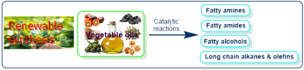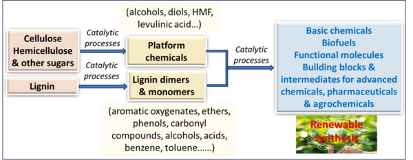 The production of chemicals and energy relies mainly on non-renewable fossil-based feedstocks. However, the future depletion of these fossil-based resources imposed to search for renewable resources as alternatives. The transition to renewable feedstocks offers significant sustainability benefits and supports the development of a circular economy. Thus, effective utilization of renewable resources to produce chemicals, fuels and energy is a major goal of chemical research. Among the different renewable resources, biomass is an organic polymeric material that can be converted into a wide range of higher-value products, including biofuels, biochemicals, and bioplastics. Hence, our work is devoted towards the catalytic valorization of lignin-, cellulose and related sugar-based biomass to value added chemicals, biofuels and functional molecules as well as advanced feedstocks and intermediates for chemical, pharma and agrochemical industrials. Next, we also work on the catalytic conversion of vegetable oils, which are produced on >200 million tons per year from plant sources to essential fatty chemicals such as fatty acids, fatty nitriles, fatty alcohols and fatty amines as well as long chain olefins and alkanes under mild conditions.