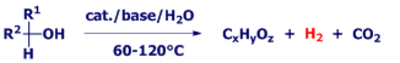 Ziel unserer Arbeiten ist die Erzeugung von Wasserstoff aus Substraten wie z.B. Methanol, Bioethanol, Glycerin, Glucose, Cellulose und Stroh mit hoher Selektivität sowie insbesondere unter milden Bedingungen. Dabei soll die Bildung von Kohlenmonoxid, einem Brennstoffzellenkatalysatorgift, unterdrückt werden. Neben Wasserstoff entstehen weitere Wertstoffe wie z.B. Essigsäure, Essigsäureethylester, Propandiol, Aceton oder Milchsäure. Ein besonderes Highlight war zuletzt der erfolgreiche Einsatz eines unserer Katalysatorsysteme in der kontinuierlichen Niedertemperatur-Wasserstofferzeugung aus Methanol/Wasser über 450 h in einer Demonstrationsanlage an der FAU Erlangen-Nürnberg (Projekt Metha-Cycle, gefördert vom BMWi).