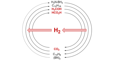 Die möglichst effiziente und langfristige Speicherung von Wasserstoff stellt eine Schlüsselfrage in der Wasserstofftechnologie dar. Basierend auf der Kombination von katalytischer Herstellung und Zersetzung von flüssigen Energie- bzw. Wasserstoffträgern werden Kreisläufe zur CO2-neutralen Speicherung ermöglicht. Solche Kreisläufe sind u.a. für Ameisensäure, deren Salzen, den Formiaten sowie Methanol denkbar. In allen Fällen wird dabei die hohe volumetrische Energiedichte der Flüssigkeiten bzw. Lösungen im Vergleich zu der des Wasserstoffs ausgenutzt.