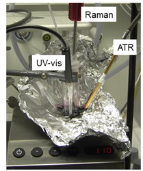 Die Messung der UV-vis-Spektren in Reflexion/Transmission erfolgt mit einem Quarz-Lichtleitersensor (AVASPEC, Avantes), der direkt in das Katalysatorbett bzw. in die Lösung eingeführt wird. Zur Messung der Raman-Spektren wird der Laserstrahl eines Raman-Lichtleiterspektrometers (RXN, Kaiser Optical Systems) durch den Quarzglas-Reaktor auf das Katalysatorbett bzw. die Lösung fokussiert. Raman-spektroskopische Untersuchungen in flüssiger Phase können auch mittels Tauch-Sonde erfolgen. Darüber hinaus steht für operando-spektroskopische Untersuchungen von gas-fest Reaktionen ein Renishaw inVia Raman Mikroskop mit einer entsprechenden Reaktionszelle (LINKAM) zur Verfügung.