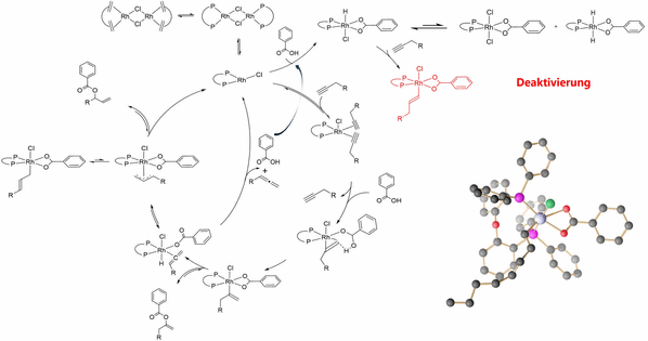 Ein Schwerpunkt unserer Arbeiten im Bereich der Grundlagenforschung sind Untersuchungen zur Komplexchemie von Rhodium-Bis(phosphan)-Komplexen in homogenen Katalysen. Als Beispiele sind hier die Aktivierung von Ammoniak mit Komplexen des Typs [Rh(PP)(µ2-OMe)]2 (PP z. B. DIOP), die Hydrierung prochiraler Olefine, z.B. mit dem Amminkomplex [Rh(binap)(NH3)2]2, Cyclisierungsreaktionen3, sowie Untersuchungen zur Katalysatordesaktivierung in der propargylischen C-H-Aktivierung zu nennen. Letztere Arbeiten werden im Rahmen eines DFG-Projekts in Kooperation mit der Gruppe Breit (Freiburg) durchgeführt.4