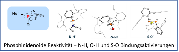 Ein weiteres Forschungsgebiet ist die Untersuchung der Chemie sogenannter Phosphanylidenphosphorane und derer schweren Homologe. Diese Systeme können als Phosphan-stabilisierte Phosphinidene aufgefasst werden und neuartige Wege des Phosphiniden-Transfers werden erforscht. Dabei soll zum einen die Aktivierung starker chemischer Bindungen (z.B. C-H, N-H etc.) an einem Hauptgruppenelement-Zentrum untersucht werden, umso neue phosphorhaltige Materialien zu erhalten oder reversible Prozesse zu etablieren, die wiederum in neuen Organo-katalytischen Transformationen genutzt werden können. Außerdem ist es möglich das Phosphan in einer Substitutionsreaktionen auszutauschen, so werden eine Vielzahl neuartiger Verbindungen einfach zugänglich (Abbildung 3).