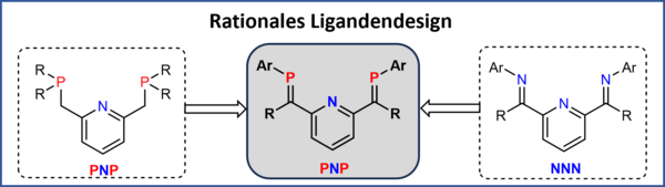 In diesem Kontext beschäftigen wir uns mit dem Design neuartiger Liganden-Systeme für die effiziente Stabilisierung niedervalenter früher Übergangsmetalle. Dabei liegt der Fokus zum einen auf einer effektiven sterischen Abschirmung des Metallzentrums und zum anderen auf den elektronischen Eigenschaften des Liganden, so dass dieser ebenfalls als Elektronenreservoir genutzt werden kann. Dabei wollen wir neuartige element-organische Reaktionstechniken mit der klassischen Koordinationschemie verbinden und die fundamentalen Eigenschaften unserer Systeme werden mit Hilfe von modernsten Analysemethoden aufgeklärt. Der Schwerpunkt liegt hierbei auf dem Einbau von niedervalenten Phosphorzentren in die Liganden, insbesondere durch den Einbau von Phosphaalken-Einheiten (Abbildung 2). Phosphaalkene können als modifizierbare Varianten des CO-Moleküls aufgefasst werden.