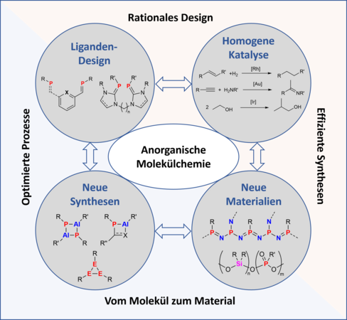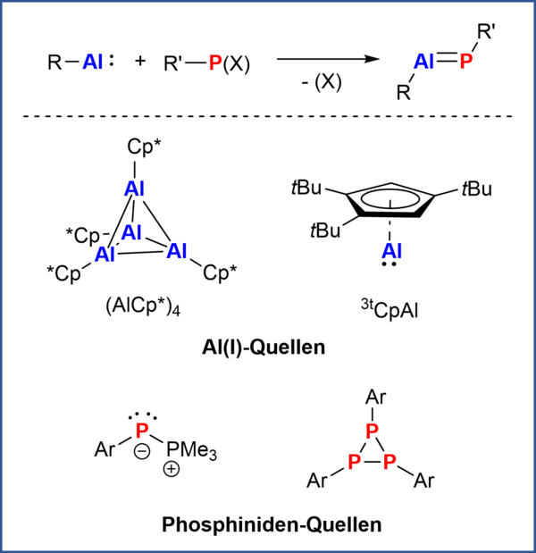 Ein weiteres Projekt beschäftigt sich mit der Synthese von Grupp 13-15 Mehrfachbindungssystemen und deren Reaktivität gegenüber kleinen Molekülen. Der Fokus liegt hierbei auf der Synthese sogenannter Phospha- und Arsaalumene, welche schwere Homologe der Alkine sind. In diesem Projekt werden sowohl Cyclotriphosphane als auch Phosphanylidenphosphorane eingesetzt um einen effektiven Phosphinidentransfer auf Aluminium-Verbindungen in der Oxidationsstufe +1 zu realisieren.
